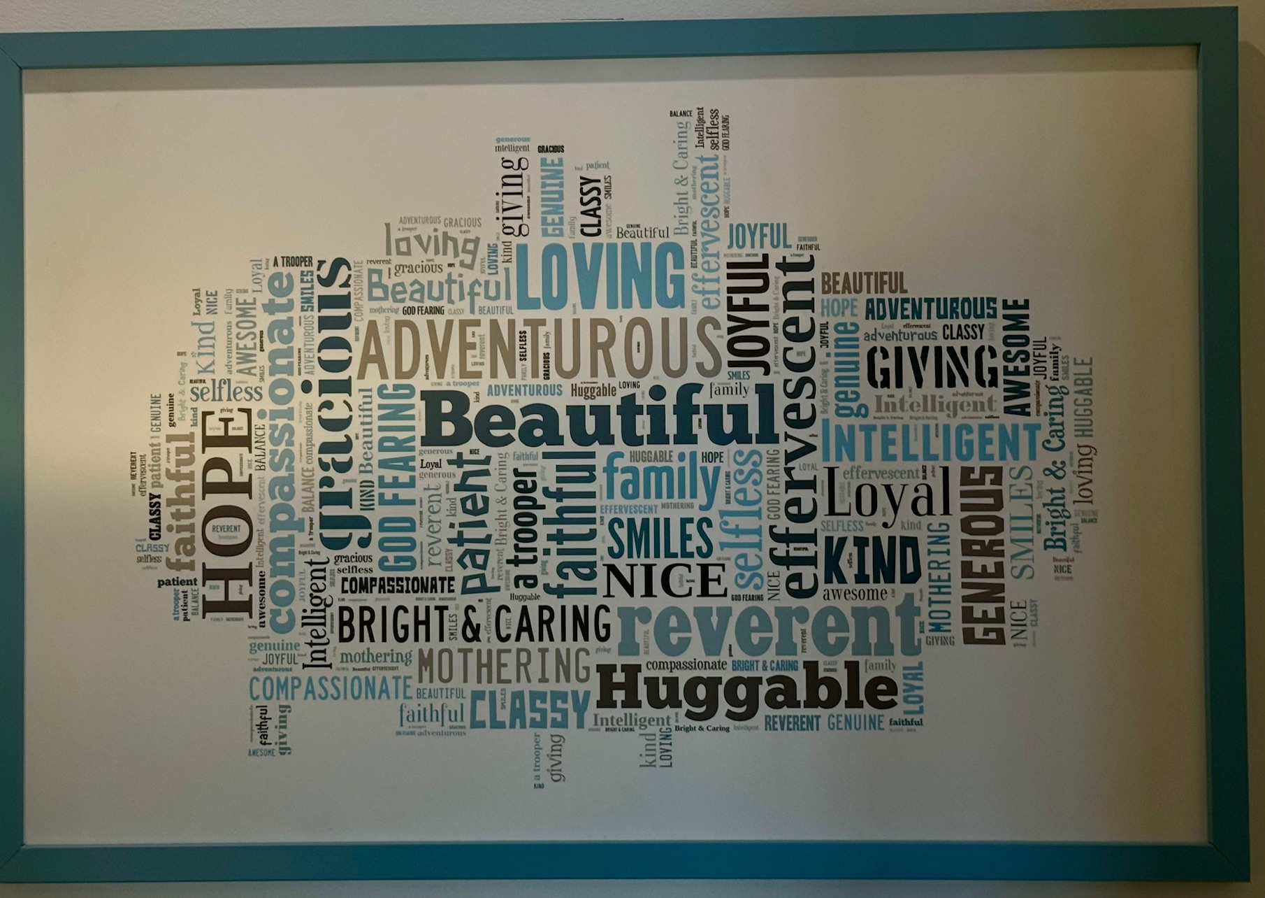 As I pray for you this morning I am looking at the newly reframed word art that I did for you some nine years ago. You know this, but for others, I asked many family and friends to describe you in one word. The results became a piece of word art wherein the more frequent a word was used the more pronounced it is in the picture.