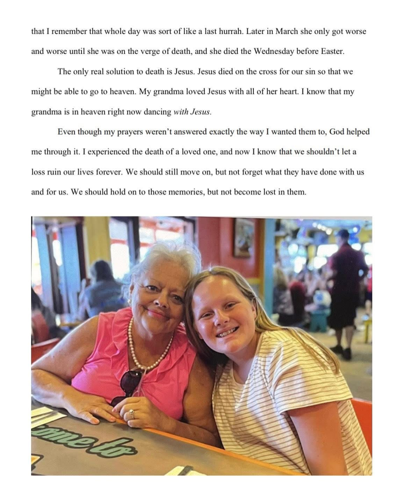 Tonight Alex had me read a paper that she wrote for her Honors English class as homework. It moved me to tears because of the memories, but also because of how mature she is in knowing her faith in God. Today is the 1 year anniversary since Meme went to heaven. I have to believe that Alex having me read this assignment on March 27th isn’t just a coincidence, and maybe a little wink from heaven🩷